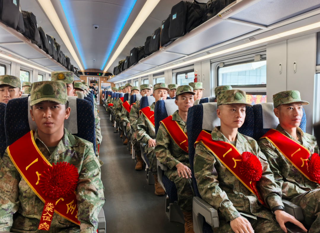 新兵們乘坐列車,整齊向軍營(yíng)。(陳學(xué)斌 攝)