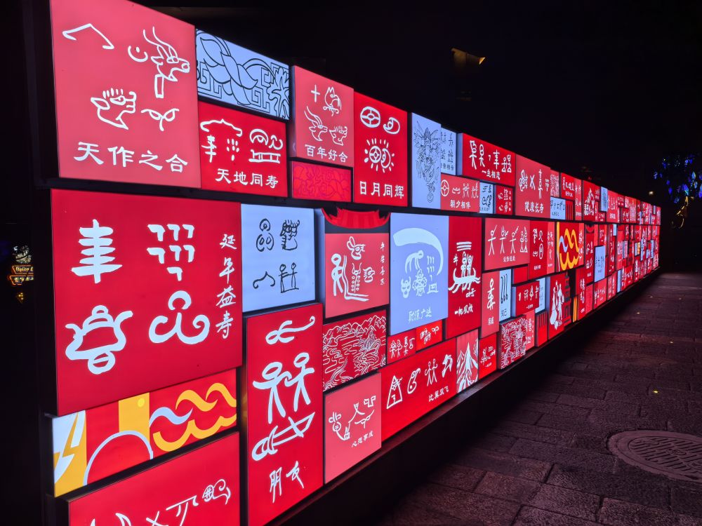 玉河走廊的東巴文化燈墻。(麗江融媒記者 木雯嬌 攝)