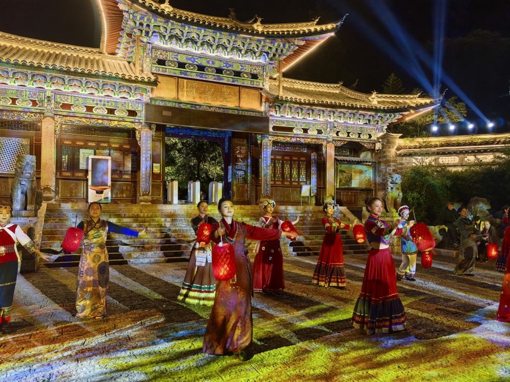 黑龍?zhí)豆珗@南門的提燈民族舞表演。(麗江融媒記者 木雯嬌 攝)