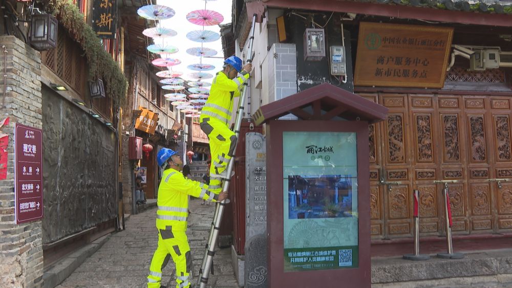 麗江移動(dòng)工作人員正在麗江古城四方街檢修設(shè)備。(麗江融媒記者 張麗瑤 攝)