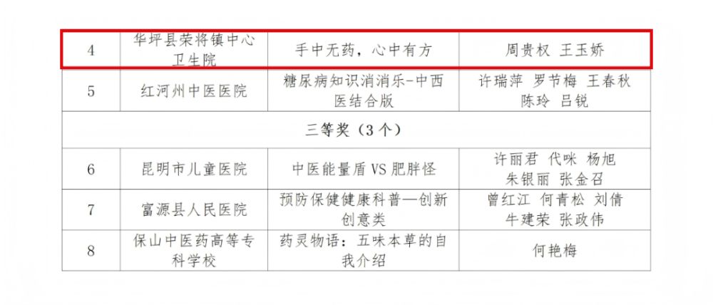 麗江市中醫(yī)醫(yī)院盧銀軍創(chuàng)作的《民族醫(yī)藥視頻》擬獲視頻類作品二等獎(jiǎng)、《立夏節(jié)氣》擬獲視頻類作品三等獎(jiǎng);盧銀軍等創(chuàng)作的《骨酥&骨舒》擬獲視頻類作品優(yōu)秀獎(jiǎng);華坪縣榮將鎮(zhèn)中心衛(wèi)生院周貴權(quán)、王玉嬌創(chuàng)作的《手中無(wú)藥,心中有方》擬獲創(chuàng)新創(chuàng)意類作品二等獎(jiǎng)。