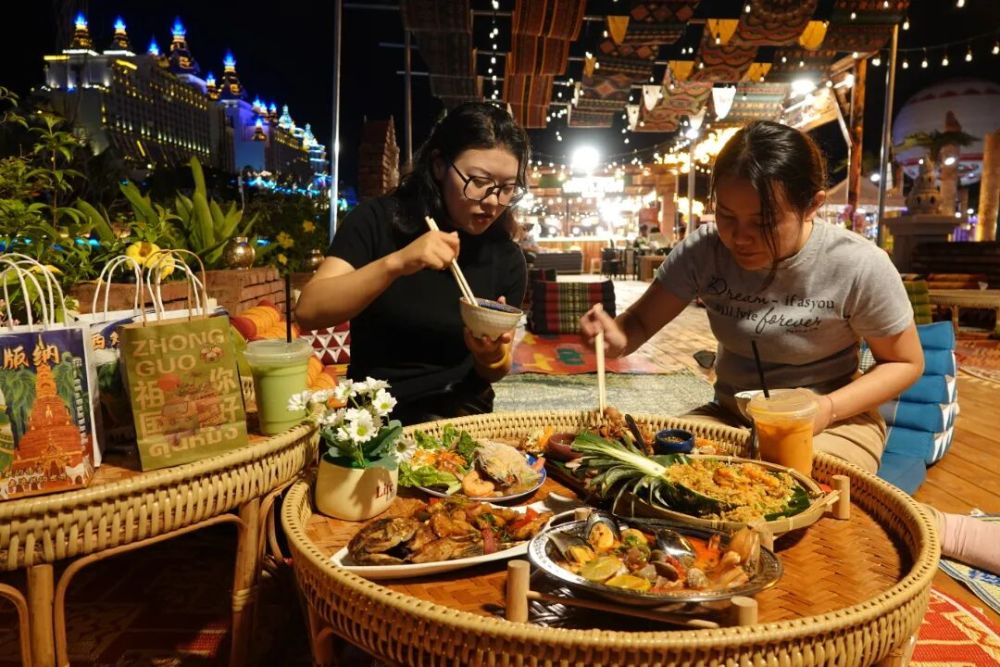 來自四川的游客黃竹告訴記者:“今天剛到西雙版納,沒想到也能感受到泰國風(fēng)情,不用出國,既安全又很方便,真的非常開心?!秉S竹曾經(jīng)去過泰國,如今坐在泰國街里的芭提雅?夜宴餐廳,邊用手機拍下獨具特色的泰式飾品,邊品嘗著色香味俱全的泰式美食?!案杏X味道跟泰國國內(nèi)的特別像,很正宗。”沉浸在濃濃異域風(fēng)情中的她對菜品贊不絕口。