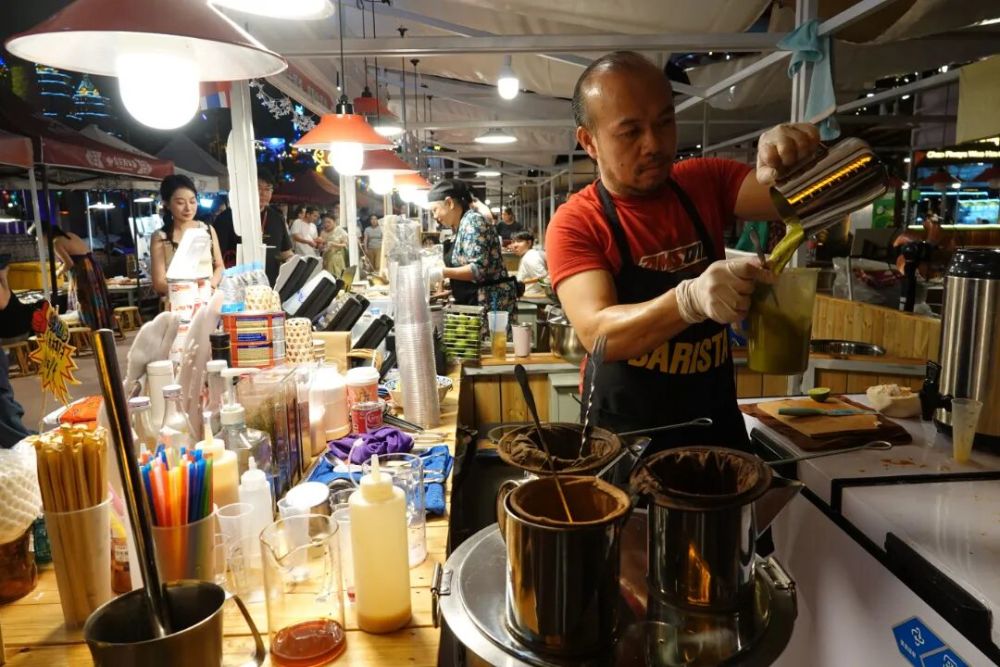 舌尖上的泰國風(fēng)味,是泰國街吸引游客的另一大亮點。冬陰功湯酸辣開胃,泰式烤腸香氣撲鼻,青木瓜沙拉清爽解膩,還有泰國本土網(wǎng)紅甜品“菠蘿炒飯”“泰式奶茶”等一一登場?!拔襾碜蕴﹪暹~,這次帶來了泰國烤腸,食材是用中國的,但是用地道的泰國方法制作,能保證味道的純正?!碧﹪虘舭⒄芨嬖V記者,他每天能賣出100多份烤腸,不少游客吃完還會打包幾份帶走。而在好泰味奶茶攤位店前,濃郁的香味、獨特的制作方法,吸引了不少游客駐足購買,店主糯?帕溫忙得不亦樂乎?!拔抑谱髂滩璧牟牧洗蟛糠质菑奶﹪鴰淼?,非常想讓中國人品嘗到真正的泰國奶茶?!?0月以來,攤位生意火爆,已經(jīng)有不少回頭客,糯?帕溫表示準(zhǔn)備在西雙版納發(fā)展下去。除了經(jīng)典泰餐,街區(qū)還引入了泰國夜市常見的“泰國打拋飯”“泰式烤豬頸肉”“泰式烤面包”等特色小吃,讓游客一站式嘗遍泰國美食。