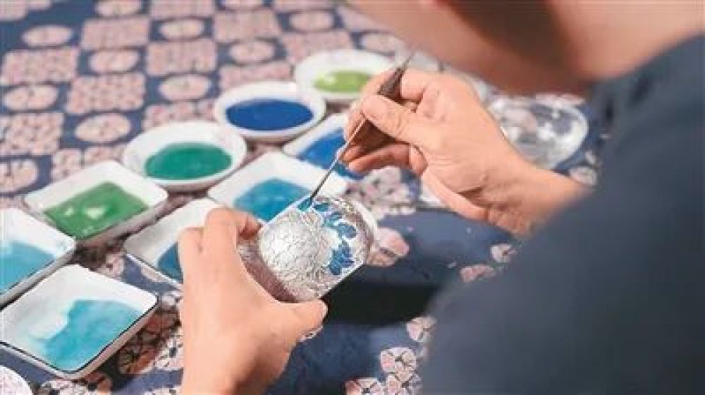 在銀胎上“填藍(lán)”。(朱遠(yuǎn)靈攝)