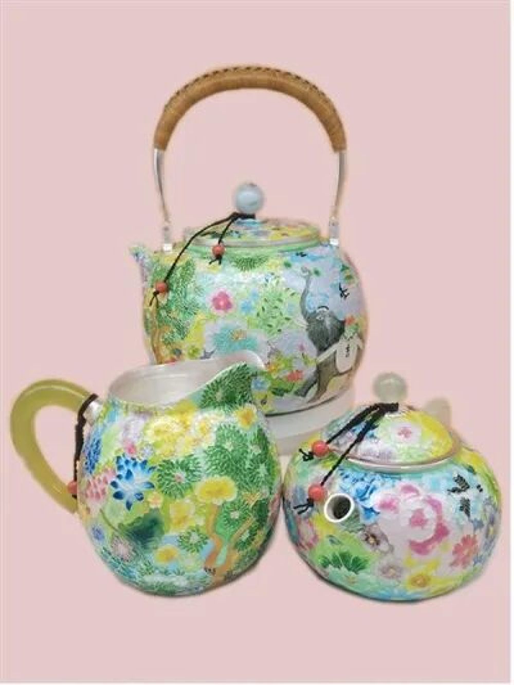 譚志平設(shè)計的茶具作品“彩銀之藍(lán)”,包含花朵、大象、孔雀等云南特色元素。(受訪者供圖)