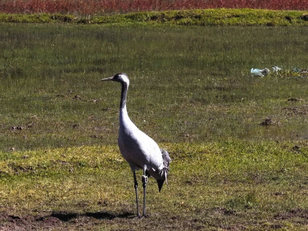 近日,管護(hù)局監(jiān)測(cè)到的首只攜帶追蹤器的灰鶴抵達(dá)拉市海越冬。(麗江融媒記者 趙鳳銘 攝)