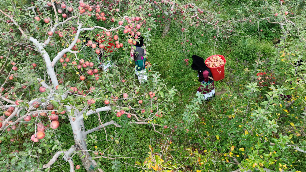 果農(nóng)穿梭在果園搬運(yùn)蘋果。(麗江融媒記者 李揚(yáng)攝)