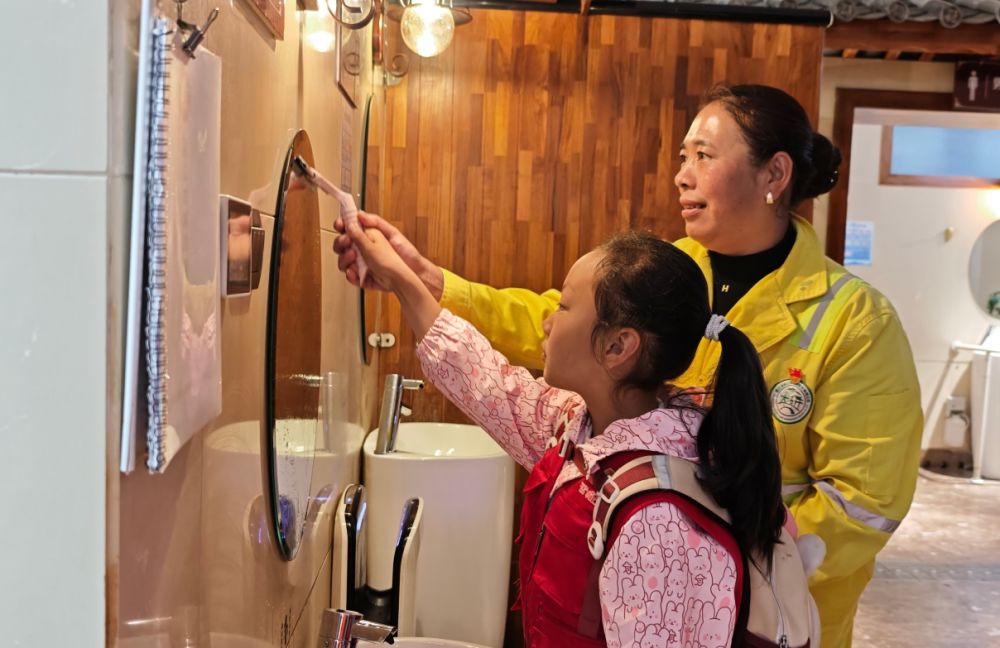 “今天我來到古城的一個公廁,嘗試著幫環(huán)衛(wèi)工人打掃洗手臺。我擦拭了許多遍才擦拭干凈,覺得環(huán)衛(wèi)工人的工作很辛苦,我們要珍惜、愛護環(huán)境。”小記者羅玉涵頗有感觸地說。