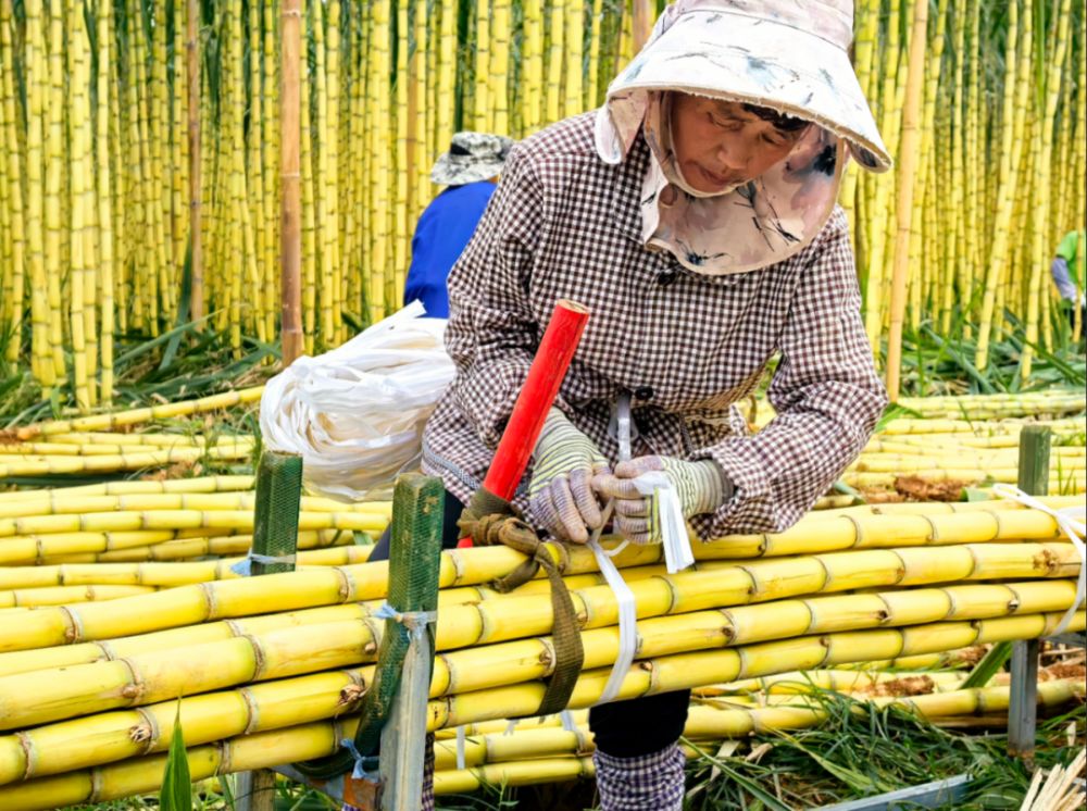 工人捆扎甘蔗。方璐 攝