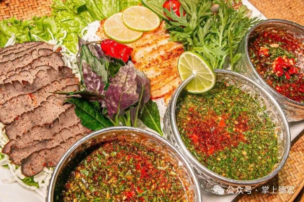 最先是從味蕾開始蔓延。德宏的味道從不是單一的刺激,而是多民族生活智慧的交融。不單一的“酸”是來自山野的百果之酸,有酸角熬成的醬、檸檬搗出的汁、羊奶果和胭脂果泡的酒,清新開胃,瞬間激活味蕾;富有層次的“辣”沒有霸道的灼燒,而是穿插了小米辣、涮涮辣、山蒼子、山胡椒根的香氣,讓人欲罷不能。小吃涵蓋的內(nèi)容也很豐富,早點是解鎖德宏的第一把鑰匙,想要讀懂德宏,至少先讀懂滿滿兩張長桌的佐料臺;撒苤充滿了德宏人的生活哲學,微苦、回甘,韻味悠長;綠葉宴、過手米線體現(xiàn)著德宏人的生活態(tài)度,包容、共享,最原生態(tài)、最直接的分享快樂;咖啡里飽含德宏人的拳拳愛國之心,從種子到杯子的新鮮醇香,保存并記錄著900余份咖啡種質(zhì)資源的密碼。當然,必須來點跨界的驚喜,503.8公里的國境線讓緬甸甩粑粑的焦香與本地腌菜膏的酸爽碰撞,25條航線帶來的“數(shù)字游民”把北方的面食揉進傣味香料,每一種新奇風味,都是溫暖的包容與共生。