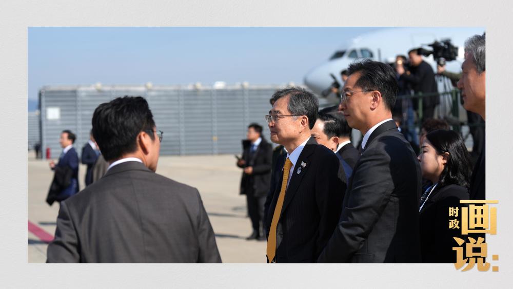△韓國外交部長趙顯在釜山金海國際機(jī)場熱情迎接習(xí)近平主席