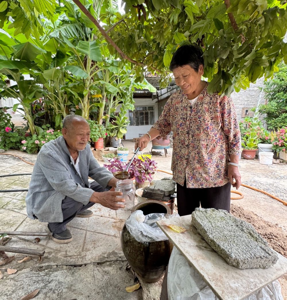 在一棵龍眼樹下,我看到幾個大小不等的陶罐,一打聽,才知是用來制作麥醬的。原來,柳奶奶從年輕時就掌握了一手做麥醬的好手藝,她做的麥醬在十里八村都有名氣,當(dāng)?shù)睾芏嘁耘腼兡竟铣措u的餐館都喜歡來奶奶這里購買麥醬。